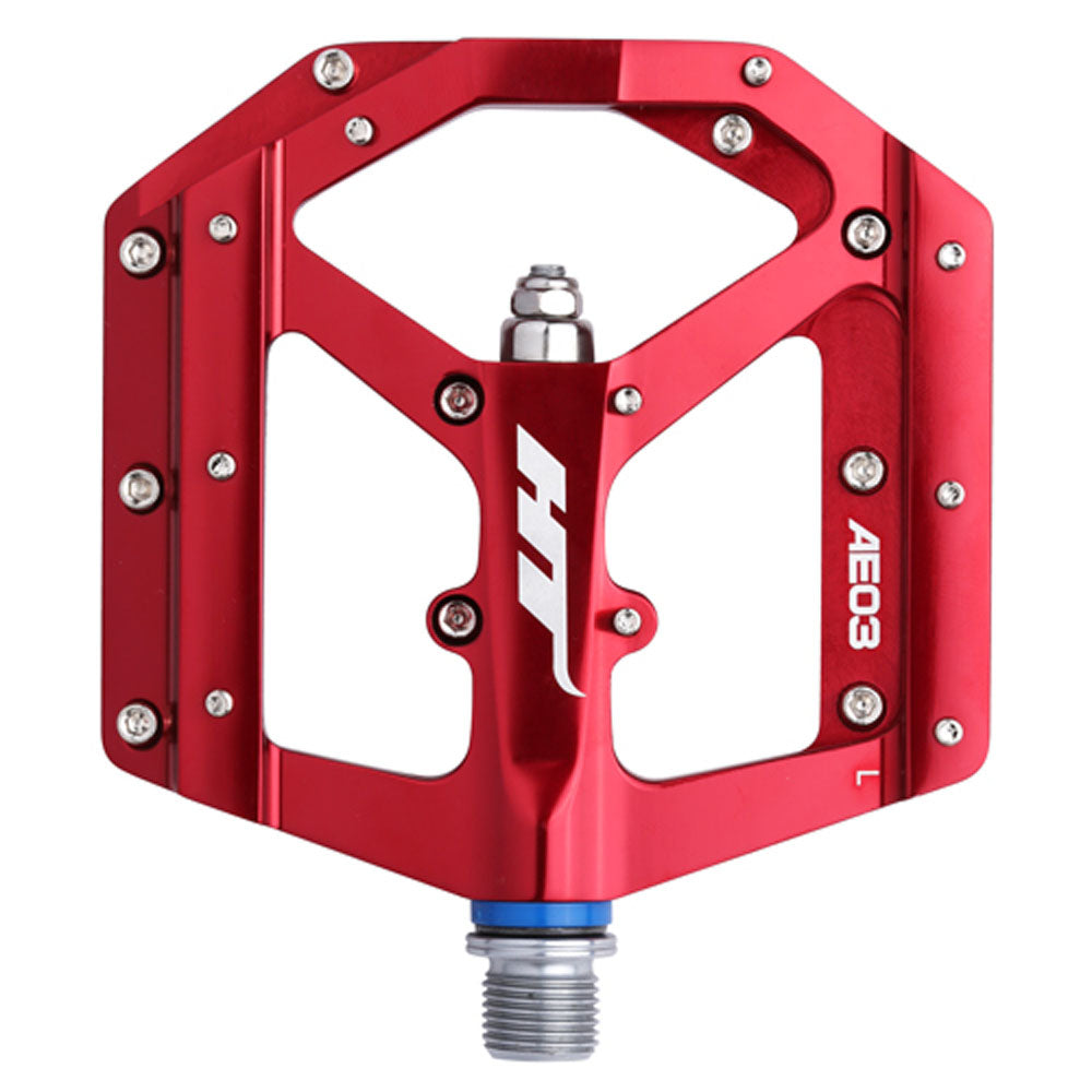 If you ride flat pedals in rough terrain, the HT AE03 pedals are an outstanding choice. The slim body gives you precious clearance from roots and rocks while keeping your foot close to the axle for control. With 10 replaceable pins and featuring the all-new EVO+ bearing system, with needle bearings and IGUS bushings these pedals are built to last you seasons of solid performance.