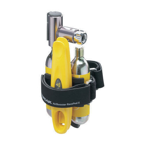 The AirBooster Race Pod X is a compact and completely self-contained tire inflation kit featuring an AirBooster CO2 inflator, two tire levers, two 16g CO2 cartridges, mounting module with strap. The unique mounting module straps to the aero or round tube, and provides lightning fast access to the AirBooster inflator, extra CO2 cartridge and tire levers. The perfect CO2 tire repair solution for racing, endurance or triathlon events.