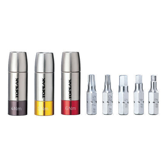 This tool set consists of 4/5/6Nm TorqSockets that will work with any mini tool containing a 5mm Allen wrench (or single 5mm Allen wrench). Its advanced torque limit release design consistently applies precise torque values on component bolts for safety and prevents damage to expensive carbon parts. A carry case neatly stores three preset TorqSockets (4/5/6Nm) and the 5 most popular tool bits (3/4/5mm hex & T20/T25 Torx).